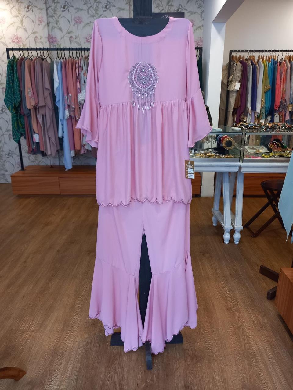 Welcome to Bally’s, a fashion house where elegance meets sparkle! Discover our exquisite co-ord set crafted from the finest diamond jorjet material, adorned with mesmerizing kurcupi work. Embrace the enchanting allure of baby pink, and indulge in the artistry of our fashion creations that exude timeless beauty and grace. Elevate your style with Bally’s, where every piece tells a story of sophistication and glamour.